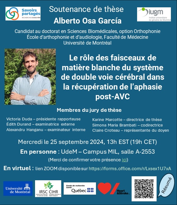 C’est avec un immense plaisir que nous vous convions à la soutenance d’Alberto Osa García le 25 septembre prochain. Il y présentera les résultats de sa thèse ayant pour titre Le rôle des faisceaux de matière blanche du système de double voie cérébral dans la récupération de l’aphasie post-AVC. On vous attend en grand nombre au Campus MIL (salle A-2553) ou sur zoom https://umontreal.zoom.us/s/81885665747