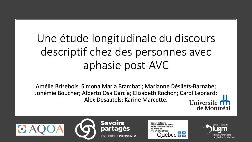 Brisebois, A., Brambati, S.M., Désilets-Barnabé, M., Boucher, J., Osa García, A., Rochon, E., Leonard, C., Desautels, A. and Marcotte, K. (2020). Une étude longitudinale du discours descriptif chez des personnes avec aphasie post-AVC. Conférence annuelle de l’Association québécoise de orthophonistes et audiologistes. Montréal, Québec, 24 novembre 2020.
