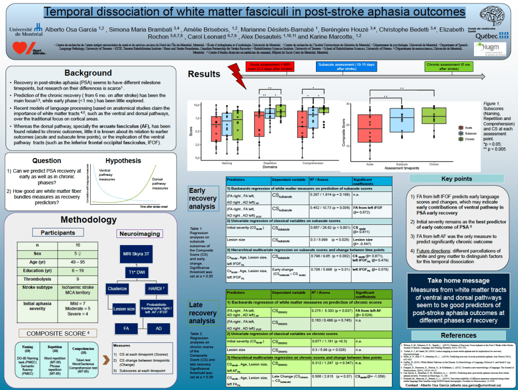 Osa García, A., Brambati, S.M., Brisebois, A., Désilets-Barnabé, M., Houzé, B., Bedetti, C., Rochon, E., Leonard, C., Desautels, A. et Marcotte, K. (2020). Temporal dissociation of white matter fascicle in post-stroke aphasia outcomes. Neurobiology of Language Conference (virtual meeting), October 2020.