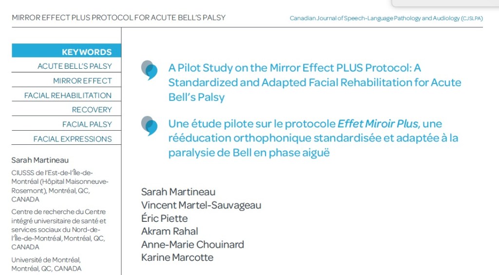 Martineau, S., Martel-Sauvageau, V., Piette, E., Chouinard, A-M., Rahal, A. and Marcotte, K. (2020). A Pilot Study on the Mirror Effect PLUS Protocol: A Standardized and Adapted Facial Rehabilitation for Acute Bell’s Palsy . Canadian Journal of Speech-Language Pathology and Audiology, 44 (2), 57-72.