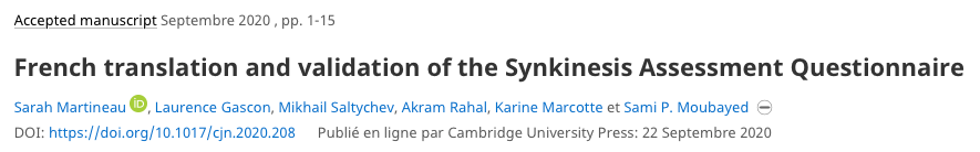 Martineau, S., Gascon, L., Saltychev, M., Rahal, A., Marcotte, K., & Moubayed, S. (2020). French translation and validation of the Synkinesis Assessment Questionnaire. Canadian Journal of Neurological Sciences / Journal Canadien Des Sciences Neurologiques, 1-15.