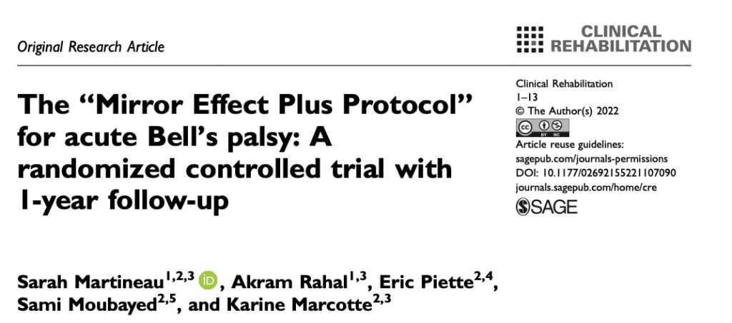 Martineau S, Rahal A, Piette E, Moubayed S, Marcotte K. The “Mirror Effect Plus Protocol” for acute Bell’s palsy: A randomized controlled trial with 1-year follow-up. Clinical Rehabilitation. June 2022.